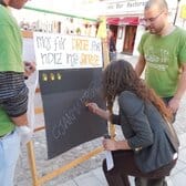 Montiamo un banchetto “alla bell'e meglio” e due cavalletti cui sono appesi due cartelloni con gli slogan della giornata: “Non spegnere la luce, tieni accesa la speranza” (sotto lo slogan, il disegno di un uomo che ne uccide un altro e a lato una candela che viene accesa, mentre due mani si stringono) e “Riconciliazione: non c'è alternativa. Non perdere l'occasione della Riconciliazione” (sotto lo slogan, il disegno di una folla di gente che raggiunge un traguardo in cui c'è scritto 'PAJTIMI' (riconciliazione), mentre un uomo, schiacciato da un masso, dal masso della 'GJAKMARRJA' (vendetta di sangue) perde sempre più contatto con la folla, si fa superare, non riuscendo alla fine a raggiungere il traguardo). Un terzo cavalletto è vicino al banchetto con un cartellone nero, in cui è scritto in bianco GJAKMARRJA.