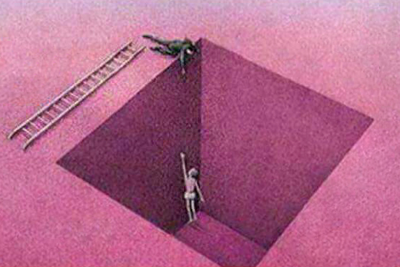 Mi mostra un disegno: una persona è caduta in un fosso profondo, un'altra, da fuori tende il braccio per aiutarla ma non ci arriva, la buca è troppo profonda. Fuori dal fosso c'è una scala, prendendola si potrebbe far uscire il prigioniero.