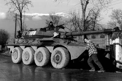 Lo spunto mi è venuto da una foto che ho fatto nel 1999 in Kossovo in cui provavo a spingere una blinda dell'esercito. Sforzi di Pace, detto anche con una punta di ironia, perché la Pace non è mettersi corone di fiori e cingersi le spalle con la bandiera arcobaleno.