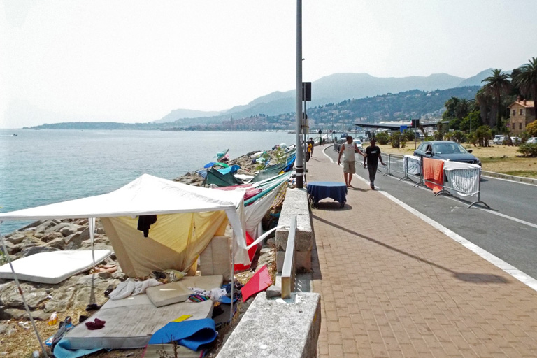 Gli scogli appaiono piegati dall’ingiustizia, rocce su cui si sono sistemate nel corso delle settimane centinaia di persone, tra tende, materassi e ricoveri improvvisati. Sono pugni negli occhi le Ferrari, le Maserati, le Lamborghini e le Jaguar che arrivando o andando verso la frontiera rallentano passando in prossimità dei migranti. Sguardi a volte di pietà, a volte di disprezzo, a volte di indifferenza. Uno spicchio di una parte di questa Europa, che fa fatica ad accettare i cambiamenti e le mutazioni di certi privilegi.