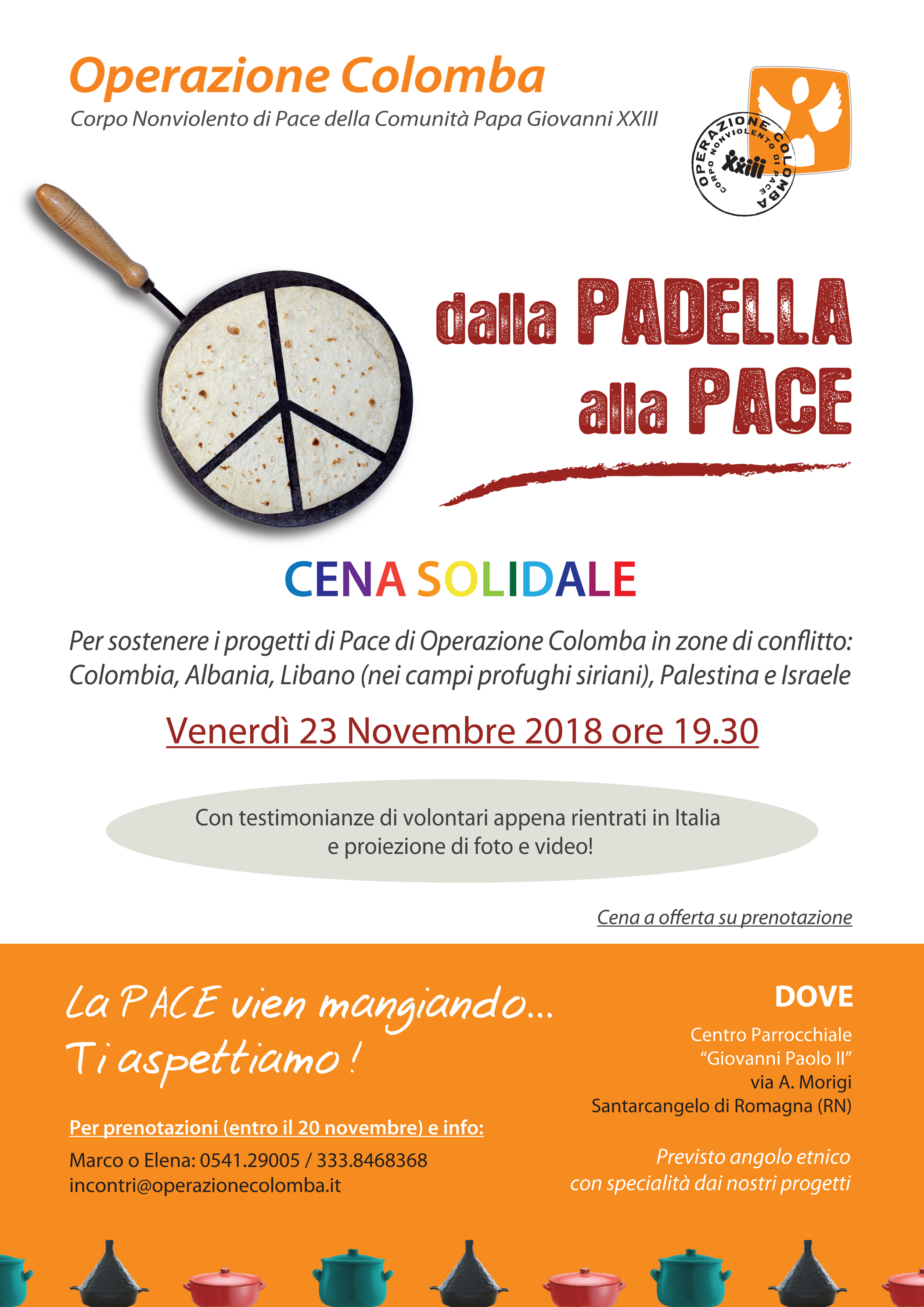 Venerdì 23 novembre, alle ore 19:30, presso il Centro Parrocchiale "Giovanni Paolo II" di Santarcangelo di Romagna - RN (vedi sotto le indicazioni), si terrà la settima edizione della Cena Solidale “dalla Padella alla Pace”!