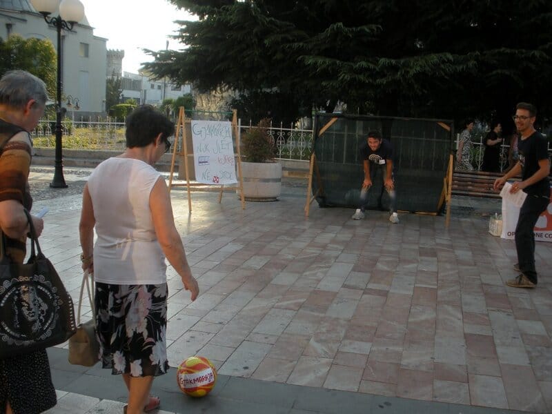 Il 12 luglio i volontari di Operazione Colomba hanno invitato tutti passanti del centro di Scutari a partecipare alla consueta Manifestazione mensile sul tema della lotta alla vendetta di sangue. Sull’onda della recente competizione calcistica Euro 2016, ai passanti è stato chiesto di non restare in panchina, ma di alzarsi e dare un calcio simbolico alla vendetta. A chi ha fatto rete è stato regalato un piccolo pallone di (simil) oro della Riconciliazione.