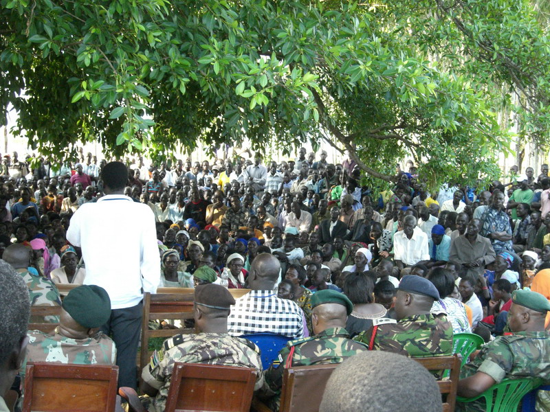 I membri del gruppo di Operazione Colomba presenti a Minakulu partecipano all'incontro tra la popolazione del campo profughi di Ngai e la delegazione composta da rappresentanti civili e legali del Lord Resistance Army e militari dell'Unione Africana. Arriviamo sul luogo dell'incontro, un prato davanti alla sede del locale LC3, alle 15, circa un'ora prima dell'orario previsto per l'arrivo della delegazione. L'ombra del grande albero è già piena di gente in piedi e, più avanti, seduta, chi a terra, chi nella platea di panche disposte a semicerchio di fronte ai due tavoli addobbati con microfoni e bottiglie d'acqua e coca cola. Però è solo un albero, ragioniamo, non più di qualche centinaio di persone, quando il campo ne ospita migliaia...