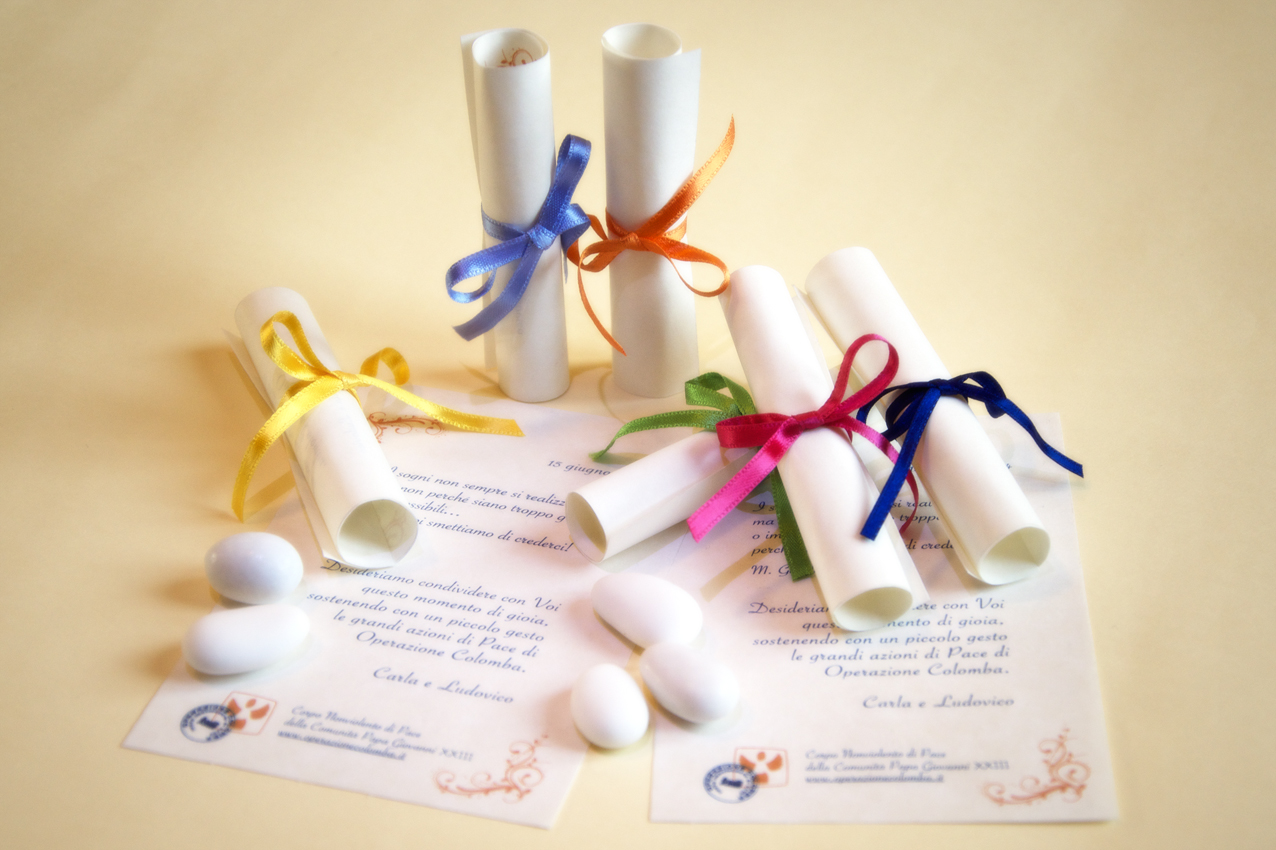 Scegli di unire alle tue bomboniere le “Pergamene della Pace”, suggellerai un momento felice con un gesto inestimabile: donare speranza non ha valore !