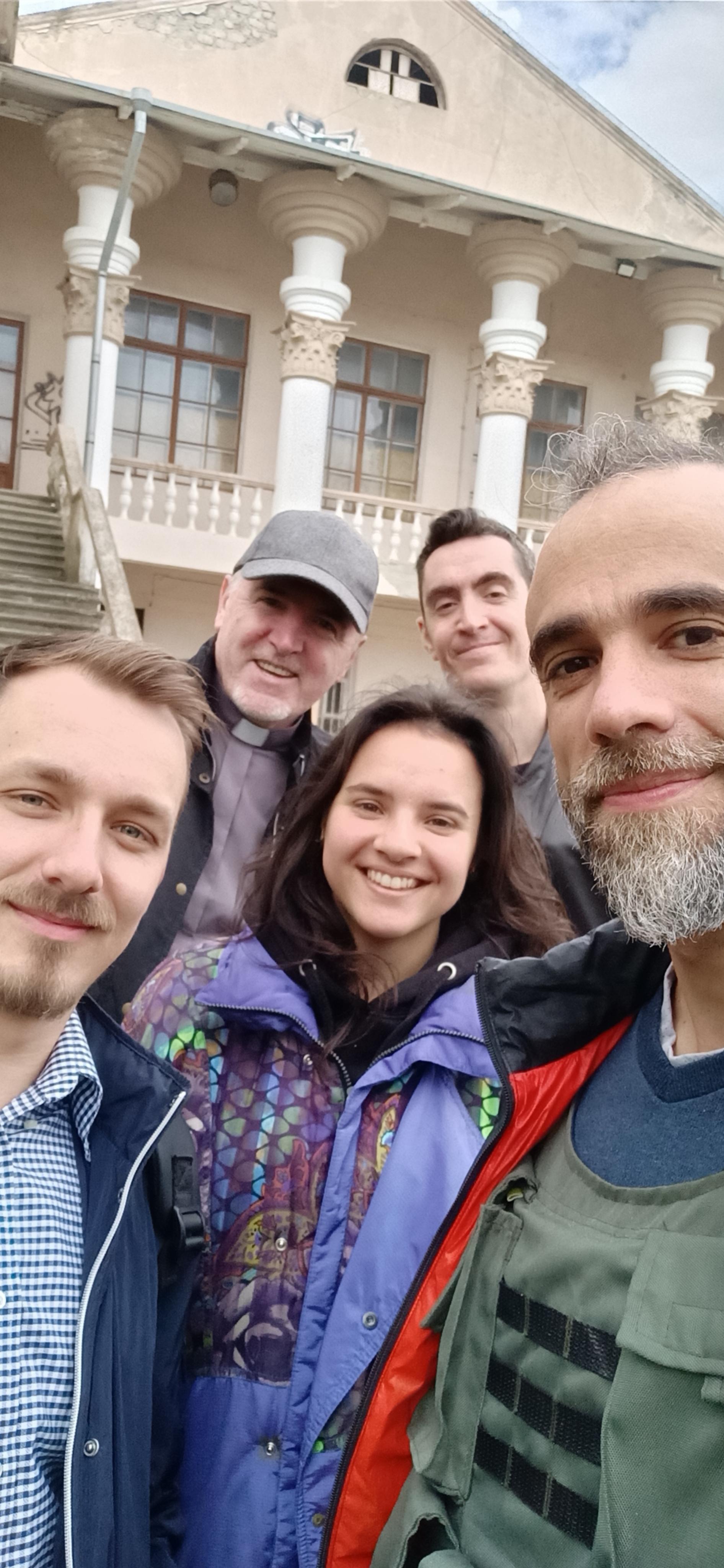 Arianna, Corrado e io, oggi accompagniamo due pastori della comunità di Mykolaiv a Kherson dove terranno una celebrazione con il gruppo locale di fedeli, nel teatro del centro culturale.
