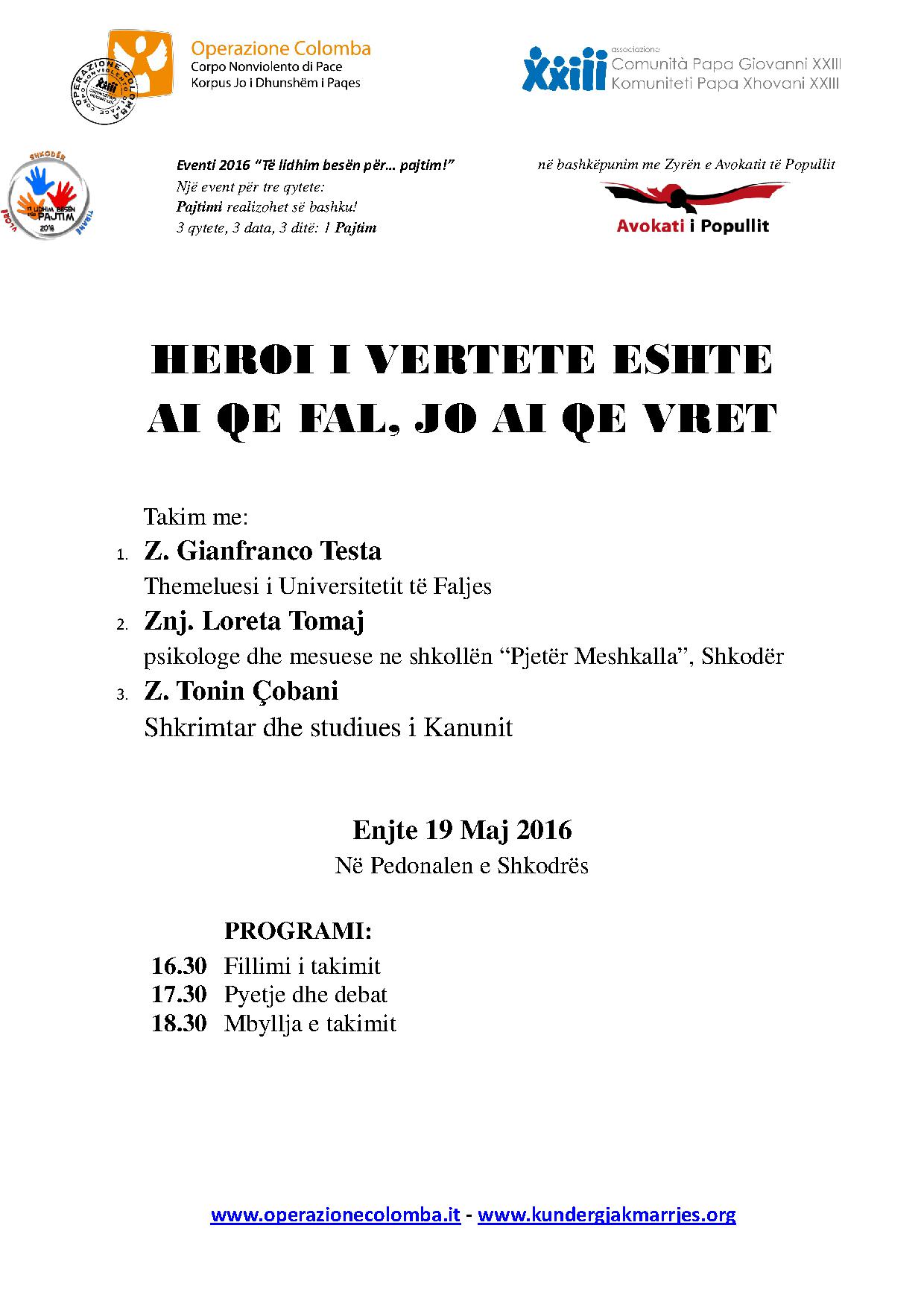 Takim publik: “Heroi i vertete është ai që fal, jo ai që vret” me z. Gianfranco Testa, z. Tonin Çobani, znj. Loreta Tomaj