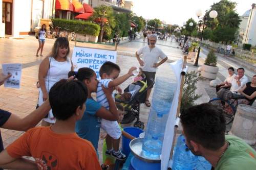 Shkodra population was involved in the event through a symbolic gesture of peace. In the pedestrian area of the city centre, indeed, it was asked people passing by to stop and to fill up a glass of water on which was written the word “pajtimi” (reconciliation), and to overthrow it in a transparent bin. On the back of the transparent bin was placed a billboard showing a graduated map of Albania. In this way, every passer-by had the opportunity to demonstrate her/his personal commitment to national reconciliation. In fact, the greater was the number of water glasses poured into the bin, the higher was the level of reconciliation wished in Albania, represented physically by the level of water slowly raising up. The activity was particularly participated; the bin, indeed, was filled up almost to the brim. The event succeeded thanks to the distribution of 400 leaflets and to the support of many volunteers of Operazione Colomba.