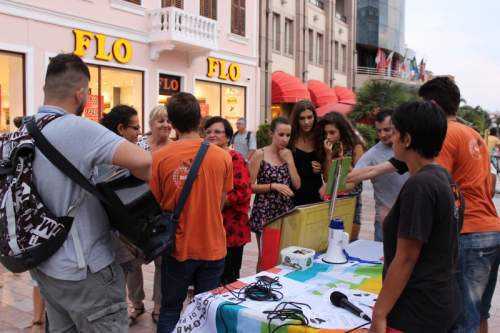 Duke simuluar funksionimin e xhuboksit, kalimtarët u ftuan të vendosin brenda simbolikisht një xhiton. Ata pastaj kanë zgjedhur dhe dëgjuar një këngë me fjalë të mira dhe përmbajtje falje, pajtimi, shpresë, jo dhunë dhe paqe. Gjatë manifestimit ata kanë shpërndarë rreth 400 fletushka. Kanë marrë pjesë në gjestin simbolik rreth 50 kalimtarë. Si çdo muaj disa pjesëmarrës e Grupit Rinore kanë kontribuar në mënyrë aktive për suksesin e manifestimit.